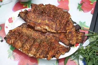 熱菜:烤紅鱒、排骨豆角面筋、鍋?zhàn)兴岵税兹?、小魚燉豆腐、肉片芹菜、土豆燒茄子、絲瓜雞蛋、炸花椒芽