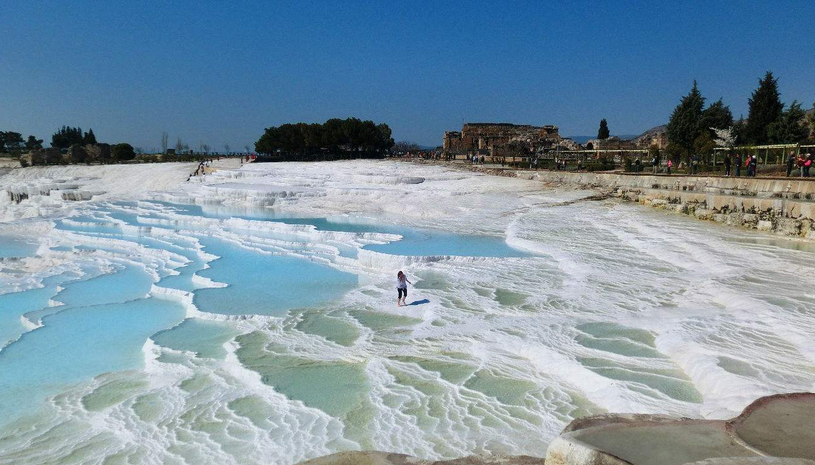 早餐后,開車前往世界七大奇觀之一——棉花堡(Pamukkale)。位于土耳其Denizli市的西南部,是遠近聞名的溫泉度假勝地,土耳其文Pamuk表示棉花,Kale表示城堡,所以Pamukkale就叫棉花堡。途中用午餐,抵達后開始游覽棉花堡景區(qū)(入內參觀約1小時左右),超過30度的熱水從地底冒出來,再沿著山邊流下,在逾100公尺的山坡上形成無數(shù)大小水池,由于池內含有大量石灰質的礦物,因而又形成一層層奶白色梯田,從兩千年前希臘時代起這里就成為風靡一時的溫泉療養(yǎng)勝地!之后游覽希拉波利斯(HIERAPOLIS)古城遺址。此城在棉花堡山頂?shù)牧硪贿叄侵帕_馬的遺跡。它與棉花堡地質奇觀咫尺之隔,是古代絲綢之路的重要站點,1988年被列為世界文化遺產(chǎn)這里有異教徒、羅馬人、猶太人和早期基督教徒的各種風格,并且融合成了一個安納托利亞式的整體。之后前往特色棉紡店參觀(時間約1.5小時左右),后乘車前往酒店。