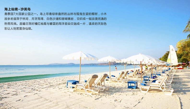 【沙美島國家海洋自然保護(hù)風(fēng)景區(qū)】這里就像世外桃源,放眼望去是滿島的椰樹、棕櫚,似乎進(jìn)入了熱帶叢林,還有美得令人窒息的細(xì)膩雪白的沙灘和清澈碧綠的海水。整個海島以藍(lán)天白云為背景、銀沙碧海作襯底的美麗海濱,近處可清澈到底,遠(yuǎn)眺海天一色,真的不需要太多的旅游景點(diǎn),只是這種清幽的度假氛圍,已經(jīng)是*難得的美麗景致了,和島上諸多歐美客一樣做個十足的“閑人”,享受陽光、沙灘、海水所帶來的無限悠閑自在。 您也可于沙美島的藍(lán)天綠樹之間進(jìn)行有益身心健康的徒步運(yùn)動,盡享與大自然零的接觸。返回芭堤雅,于養(yǎng)生康泰館內(nèi)享受泰國傳統(tǒng)的【古法按摩】(60分鐘)通過技師嫻熟的指壓技法,讓您舒筋活絡(luò),通體舒暢。(小費(fèi)自理)