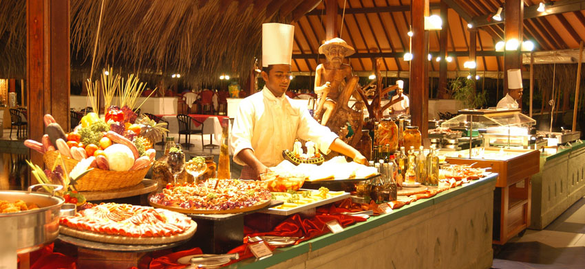 島上主餐廳,有一個(gè)門是可以直通往北面的沙灘和碼頭。主餐廳可以容納200-300人,三餐都是自助餐,菜品基本一樣。主餐廳的位置就在接待處后面。在主餐廳旁有一個(gè)半圓形的羅馬式劇場(chǎng),可以舉辦晚會(huì)、表演等。