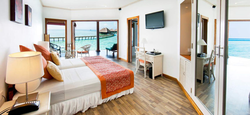 16間其中有7間是孟加拉式的水上平房,里面設(shè)施有電視、piped音樂(lè)。從自己的水上屋直接進(jìn)入海中,房間內(nèi)有一大塊的玻璃地板,從這里可以看到水下壯觀的珊瑚和海洋生物。到了晚上,可以把玻璃地板掀起,起景色不能用語(yǔ)言概括。每間水上屋都有獨(dú)立的陽(yáng)臺(tái)可以曬太陽(yáng)