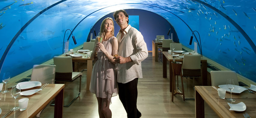 馬爾代夫海底餐廳之一,在海下5米之處,360度觀看珊瑚與魚的世界,喝著頂級的雞尾酒,品嘗馬爾代夫的西式大餐。這種體驗世間絕無僅有。