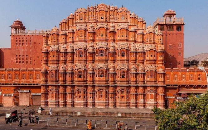 早餐后,乘車(chē)前往印度的粉紅城市-齋普爾,下午參觀:【★城市宮殿City Palace】:位于齋浦爾市中心,館內(nèi)收藏著昔日珍貴的雙輪戰(zhàn)車(chē),裝著印度恒河圣水水甕及陳列著歷代馬哈拉加的服飾、樂(lè)器、武器及各種印度器皿等(游覽時(shí)間不少于80分鐘)。