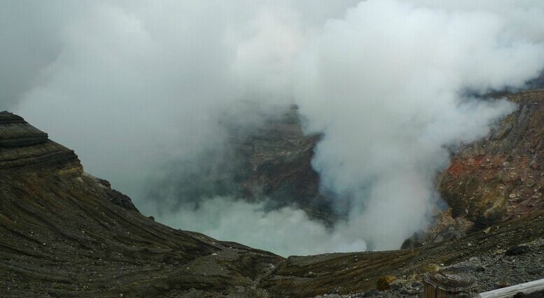 【阿蘇山火山】(纜車自理)世界著名的活火山。順著索道上到標(biāo)高1506M的山頂就會聞到硫磺的味道,可以近距離的看到火山口噴出煙霧的樣子。只有活火山的周圍有躲避洞。