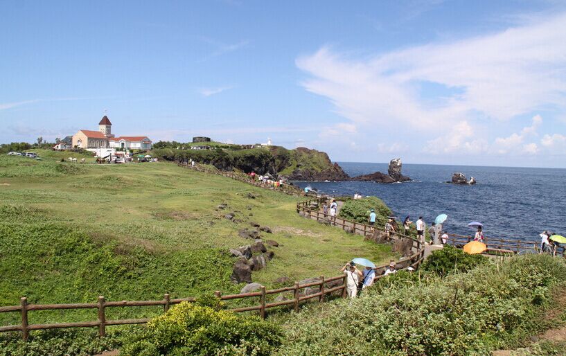 【涉地可支】(停留時間約30分鐘)涉地可支位于韓國濟州島東部海岸的一端?!吧娴亍笔沁@一地區(qū)古代的名稱,“可支”是濟州島方言,意思是指外凸出的地形。這片海岸岬地因為作為韓劇《ALL IN》中的場景而變成熱門景點。矗立在坡地上的白色美麗教堂、修女院建筑十分顯眼,具有歐洲風味,遠遠地就能吸引住眾人的目光。