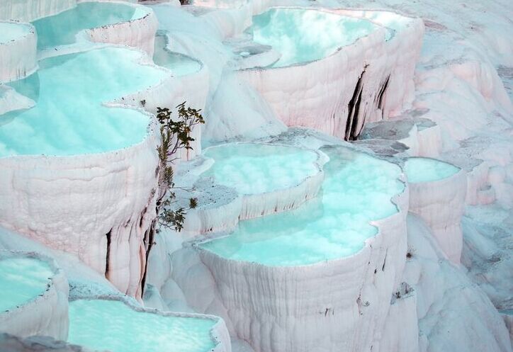 ※ 棉花堡:棉花堡(Pamukkale)在土耳其的紡織工業(yè)重鎮(zhèn)代尼茲利(Denizli),位于西南部山區(qū)。土文Pamukkale由Pamuk(棉花)和Kale(城堡)兩個字組成,棉花是指其色白如棉,遠看像棉花團,其實是堅硬的石灰?guī)r地形。城堡是說它由整個山坡構成,一層又一層,形狀像城堡,故得名棉花堡。此地多溫泉,溫泉自洞頂流下,將山坡沖刷成階梯狀,平臺處泉水蓄而成塘,人可坐在里面泡溫泉。